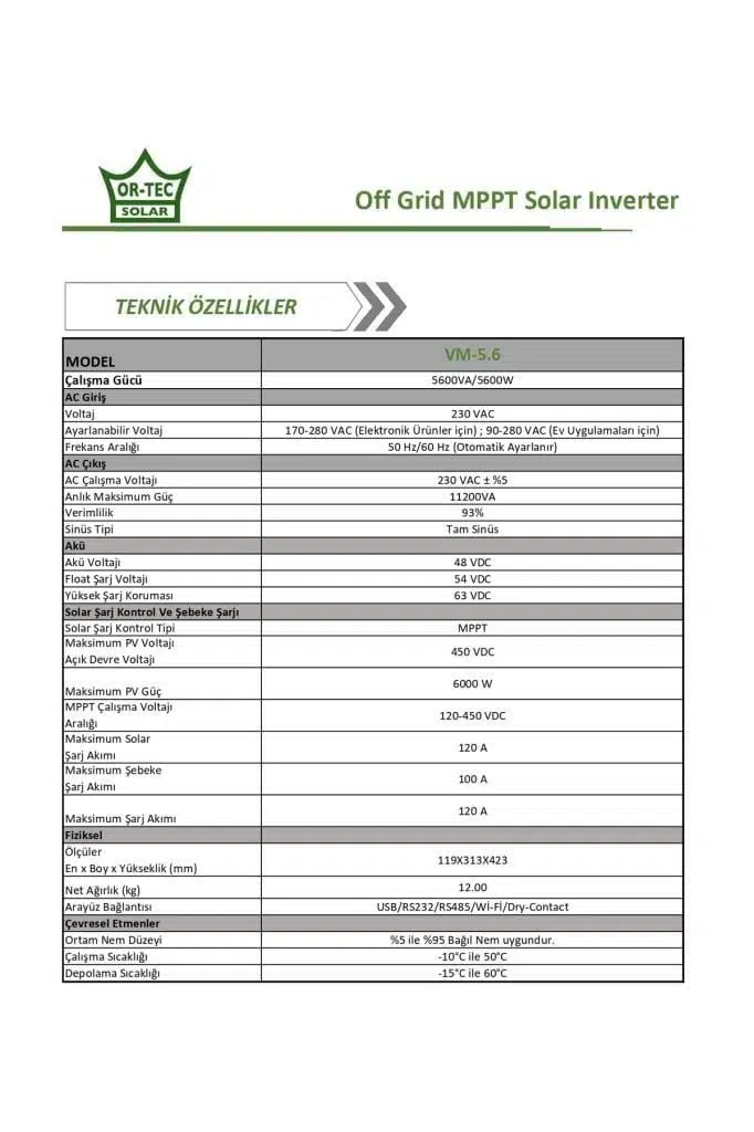 Ortec Solar 48V 5.6kW/5600VA MPPT Wi-Fi Tam Sinüs Akıllı İnverter, yüksek verimlilik ve yenilikçi özellikler ile güneş enerjisi sisteminizi güvenilir şekilde destekler. Lityum batarya uyumluluğu, Wi-Fi haberleşme, MPPT teknolojisi ve aküsüz çalışma gibi avantajlarla, enerji sisteminizin verimliliğini artırabilir ve sürdürülebilir enerji çözümleri elde edebilirsiniz.
